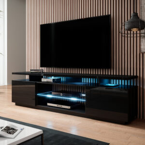 Van een minimalistische, eenvoudige kast met gesloten fronten hebben we een nieuwe en nog functionelere kast gemaakt. SLIDE tv meubel met een plank geeft karakter aan de kamer door de glans op de fronten, zijkanten en bovenkant.